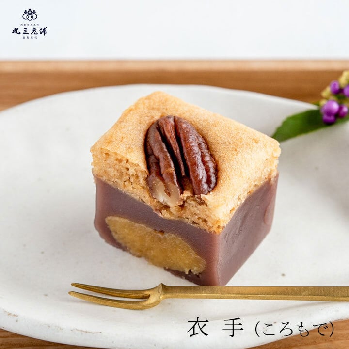 茨城県産の最高級干し芋「ベニハルカ丸干し」を丸ごと1本使った蒸し羊羹と、キャラメル風味の浮島(餡を使った和風スポンジ)を流し合わせ、大粒ピーカンナッツをあしらった、オリジナル創作菓子。一見洋菓子のようにも見えますが、お味は完全に和風です。